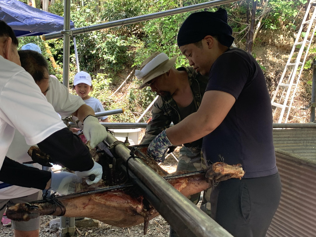 大きないのししを丸2頭、じっくりと焼き上げる。