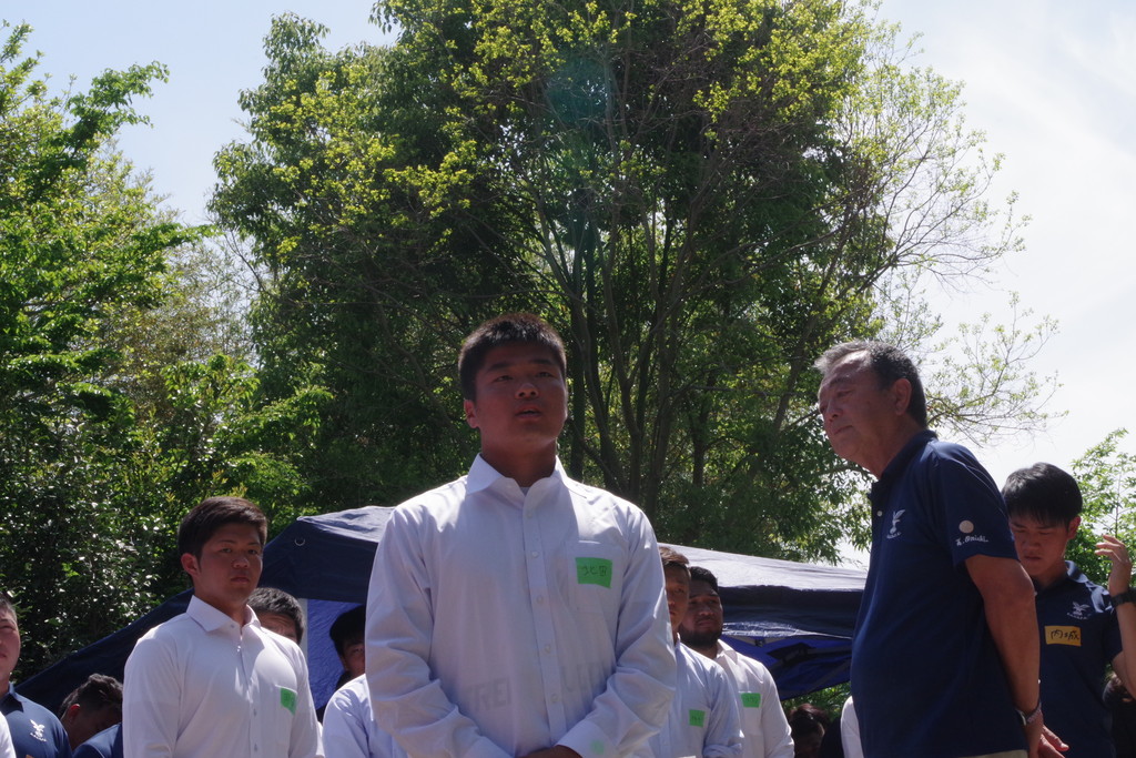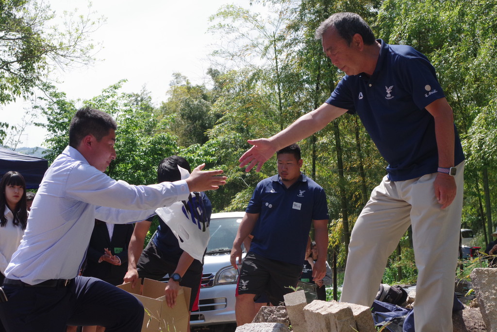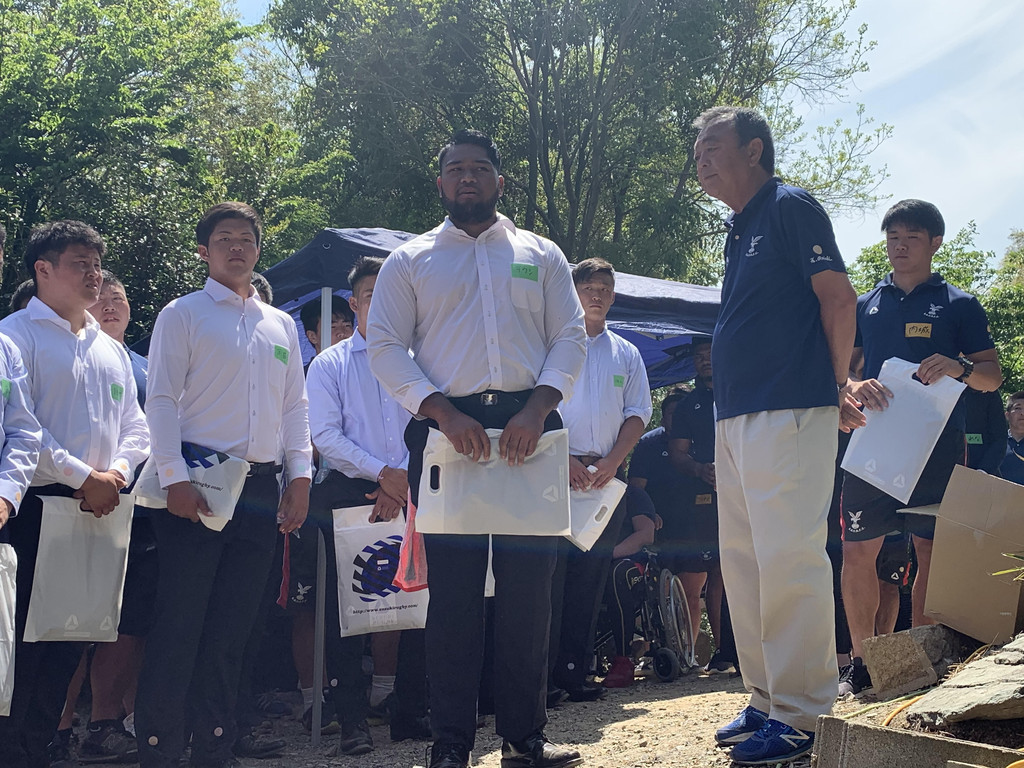 大西監督を囲み、メインとなる新入生の紹介。指揮官に名前を呼ばれ、握手を交わし、京産大ラグビー部の証であるポロシャツが手渡される。受け取った選手は4年間の抱負を述べる。