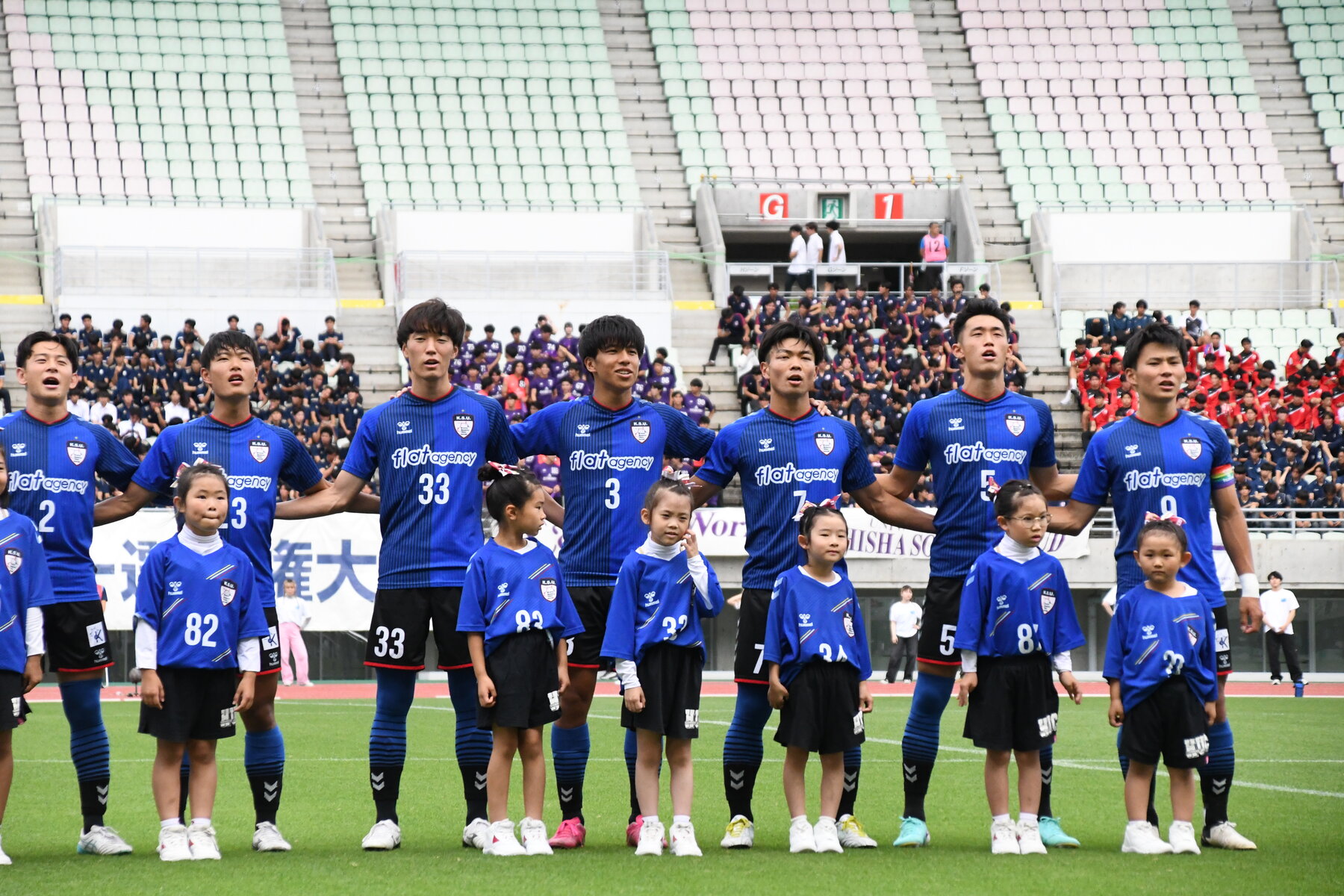4000人近くの観衆が見守るヤンマースタジアム、ムッとするような湿気に風がなびく。決勝戦ならではの演出や放送がなされる中、選手らはピッチ内へと整列。各校の学歌が流れ、肩を組み元気よく歌い出す京産大イレブン。ベンチの選手や首脳陣らも笑顔で歌い上げた。
