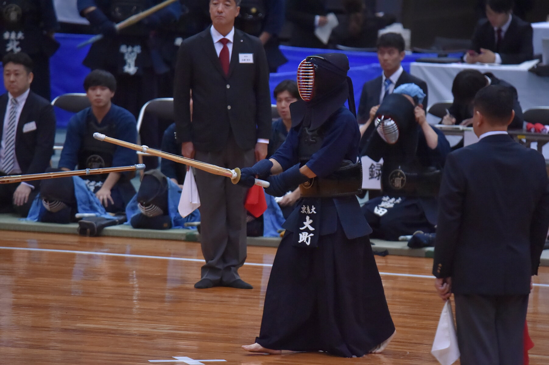 初戦の相手、優勝候補の一角である国士舘大に対し引くことなく果敢に攻める京産大。先鋒は国士舘に軍配が上がったが、次鋒の大町拓海(2年=育英)は、相手が引き技で下がったところを瞬時に間合いを詰めて合い面を誘い、見事メンを決め一本勝ち。しかし、続く全国屈指の剣士たちを前に一歩及ばず、1-5で初戦敗退となった。