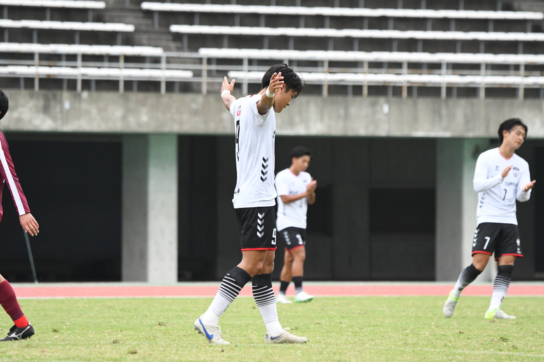 昨年王者・阪南大に勝利した勢いで連勝したい第2節は中2日で桃山大との対戦となった。今日も立ち上がりからペースを握る。24分、高川がGKへのプレスからボールを奪うと、1人ゴールへ向かって運び、公式戦3試合連続となる得点で先制点をあげる。