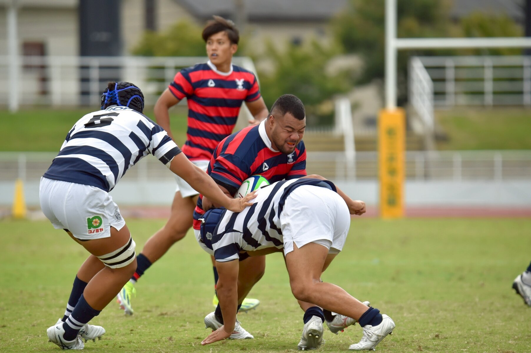 リードを奪い主導権を握った京産大は前半27分、再び深くまで攻め込む。敵陣5mからのラインアウトのチャンスをオーバーするミスも、奈須の鋭いタックルで相手が落としたボールを伊藤が素早くジャッカル。パスを受けたポルテレが相手ディフェンス2人をなぎ倒し、左サイドに突っ込み追加点を挙げた。ポルテレは8月の菅平合宿で右手中指の靭帯を断裂する大けがを負ったが、手術すると復帰まで2,3カ月を要する。「僕がオペをしたら4回生のラグビー人生が終わる。やるからには絶対頑張りますので出してくださいと言った。」とポルテレ。自身も最後の秋シーズンだ。リーダーとしてチームを背負い、執念と覚悟を持ってグラウンドに立ち続ける。