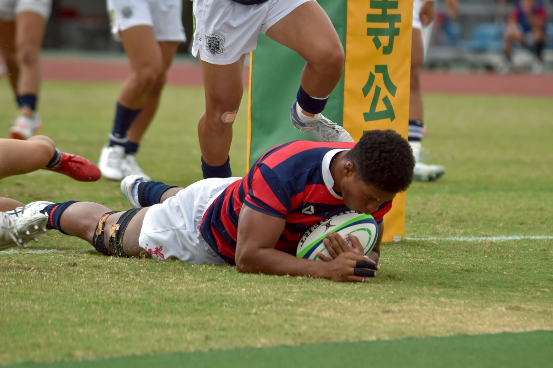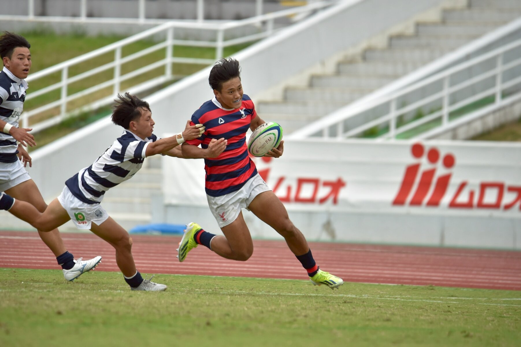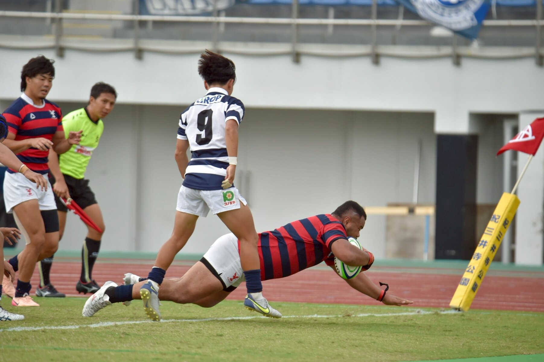 後半も畳みかけたい京産大は7分、自陣22mでドロップキックをキャッチした奈須が独走。相手ディフェンスをくぐり抜け、さらに2人をかわしてトライを決め、スタンドを沸かせた。その直後も勢いそのままにチャンスを作る。自陣22m付近でのラインアウトから展開すると、またも奈須が持ち前の加速力で一気にゲイン。最後はオフロードを受けた馬田がゴールまで運び、リーグ戦初トライを決めた。